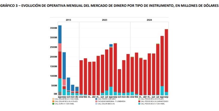 El instrumento Call pesos BCU (H) garantizado fue el de mayor demanda, representando el 94,9% del total operado en el mercado de dinero y experimentando una suba del 25% en la comparativa mensual, producto de operaciones por 3.267,1 millones de dólares.