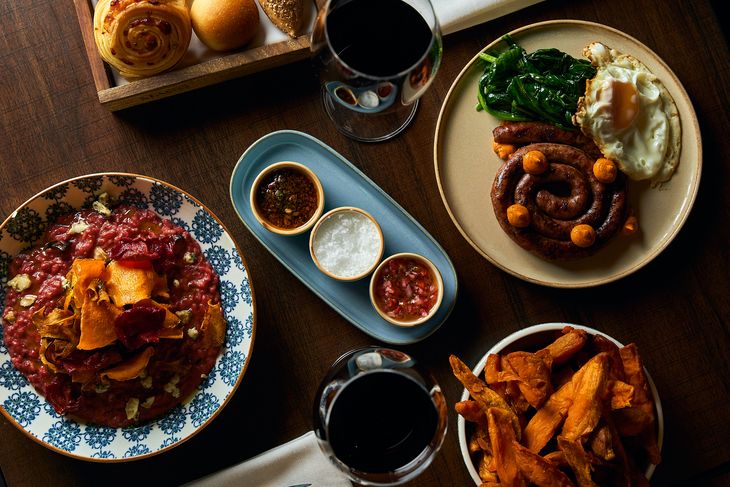 Como siempre, en el corazón del menú, la parrilla es la protagonista y en ella se exhiben suculentos cortes como el T Bone, la ceja de bife o la pamplona de ojo de bife, que sale rellena con hongos a la parrilla y queso provolone. Además, otra parte vital de su propuesta es la selección de vinos, curada por la sommelier Marcela Rienzo, que reúne etiquetas de más de 18 provincias vitivinícolas argentinas, incluyendo orígenes menos explorados como Chubut, Entre Ríos y Jujuy. La cava central del salón, visible desde todas las mesas, es reflejo de esta diversidad.