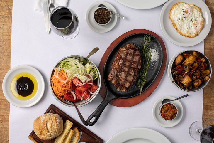 Además, cuenta con opciones como empanadas de carne cortada a cuchillo, tortilla de papas con corazón de provolone, pastas caseras -como raviolones de lomo- y postres tradicionales, entre ellos el flan casero, el vigilante y el panqueque de dulce de leche Chimbote. La selección de vinos incluye etiquetas de las mejores bodegas argentinas, ideales para acompañar cada plato.