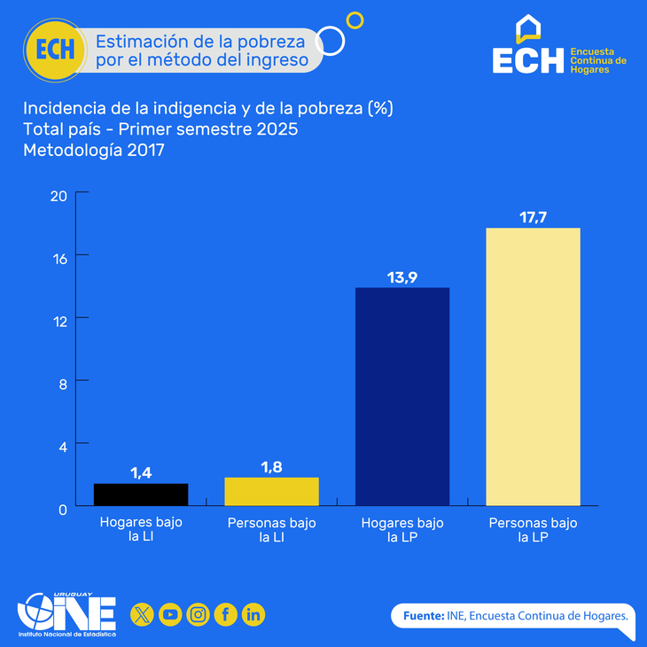 La pobreza en el Uruguay durante el primer semestre del año ascendió al 17,7% en las personas y al 13,9% en los hogares, según estableció el último informe del Instituto Nacional de Estadística (INE) al presentar por segunda vez resultados con la nueva metodología anunciada a comienzos de 2025 con el gobierno de Yamandú Orsi.
