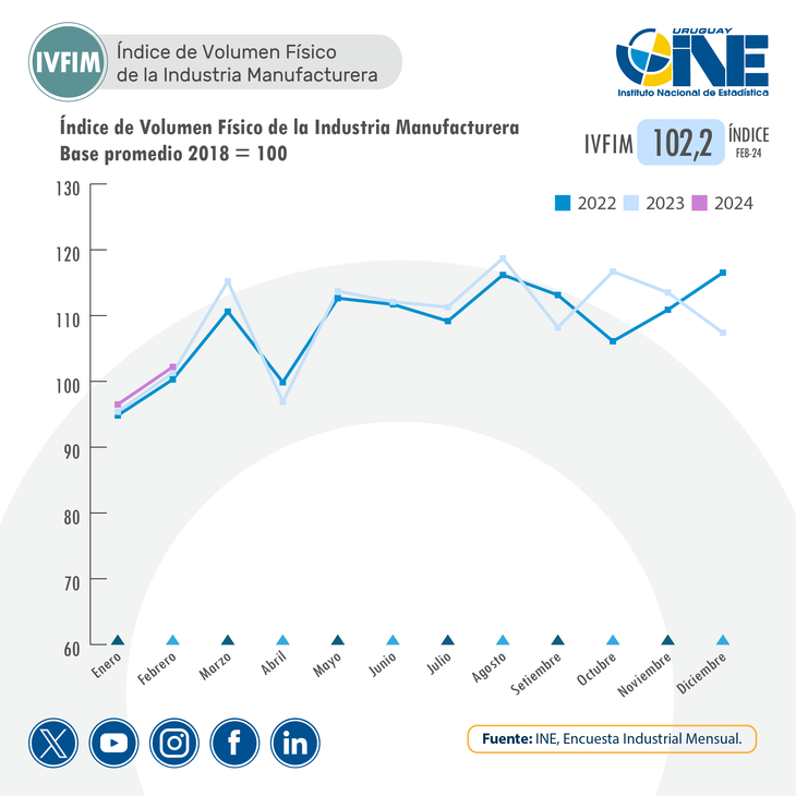 La producción industrial mejoró un 0,9% interanual en febrero, ratificando un comienzo de año positivo tras la suba de enero, de acuerdo a los datos del Índice de Volumen Físico de la Industria Manufacturera (Ivfim), que elabora el INE.