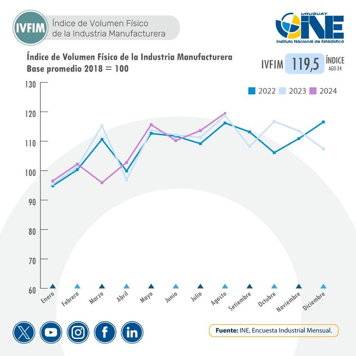 El Índice de Volumen Físico de la Industria Manufacturera (IVFIM) creció 0,7% a nivel interanual, especialmente impulsada por una mayor elaboración de celulosa, y en menor medida por la fabricación de productos farmacéuticos, así como sustancias y productos químicos.