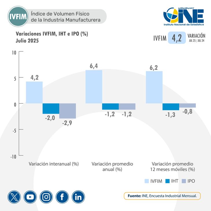 La producción industrial se incrementó un 4,2% interanual en julio de la mano de los alimentos, de acuerdo al último boletín del Instituto Nacional de Estadística (INE), que exhibió una suba más moderada para el índice sin refinería (2,3%) y el núcleo manufacturero (1,8%).