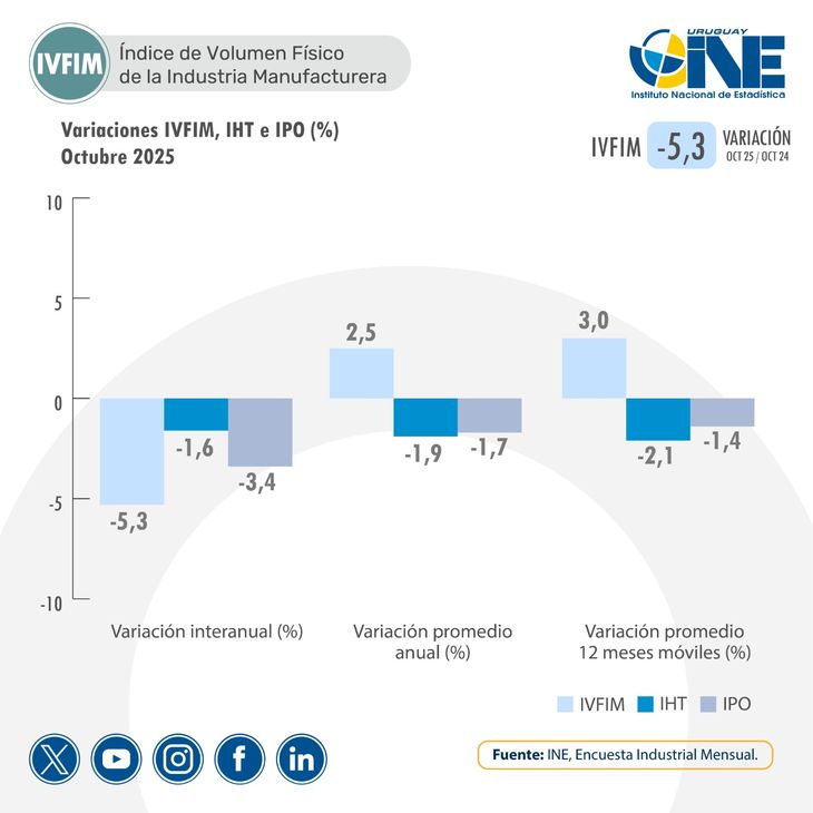 El indicador retrocedió un 5,3% interanual en octubre, a pesar de la reactivación de la refinería de Ancap.