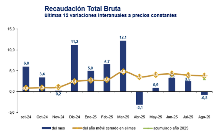 La recaudación bruta alcanzó los 54.422 millones de pesos en agosto, lo que supone un retroceso del 0,8% real en comparación con igual mes del año pasado, de acuerdo al último informe de la Dirección General Impositiva (DGI).