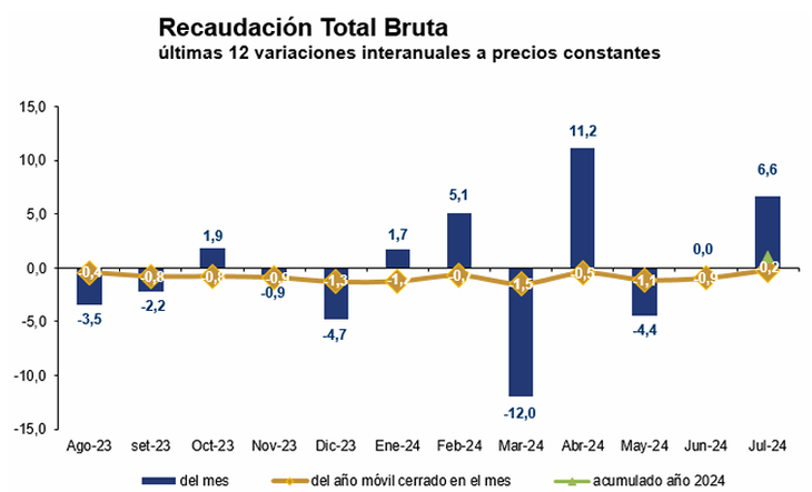 En el acumulado de los últimos 12 meses, la recaudación bruta está en un nivel similar que en el de 2023, pese a registrar una caída del 0,2%.