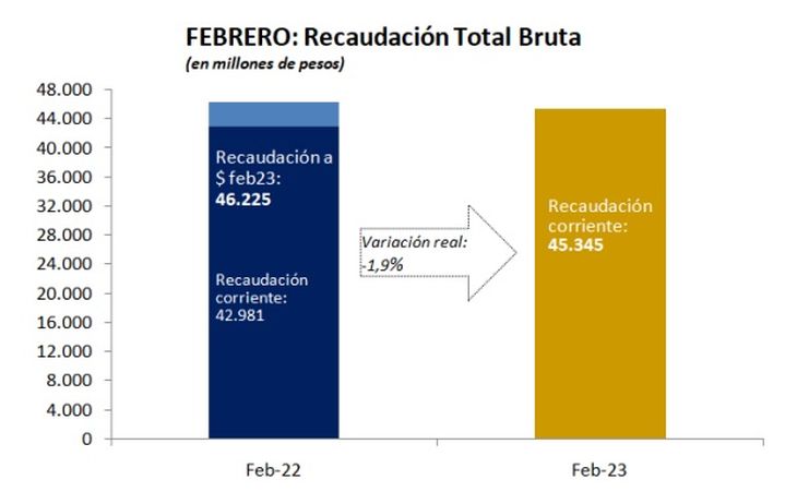El total de recaudación bruta de la DGI en febrero del 2023 fue de 45.345 millones de pesos lo que, según la dirección, implica una variación del 5,5% de precios corrientes y una variación interanual del -1,9% si se le descuenta la inflación. Según el informe de la DGI, la recaudación bruta mostró una baja en la recaudación desde el mes de Agosto de 2022 que tenía una variación positiva interanual en la recaudación bruta del 8,9% en comparación con el mismo periodo de 2021.
