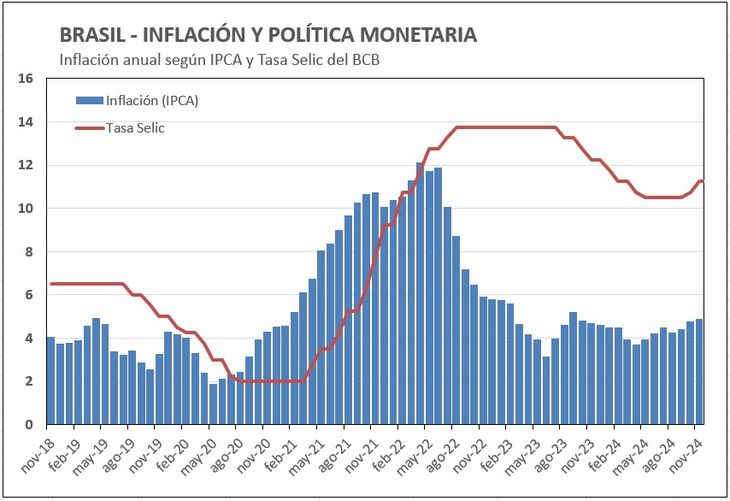 Por su parte, el Banco Central de Brasil (BCB) buscará bajar la inflación, que quedó por arriba del techo de su rango meta (4,5%). Para esto seguramente aumente nuevamente la tasa de interés. Pero esto no solo tendría consecuencias en la actividad, sino que también podría aumentar la carga de intereses de la abultada deuda norteña.