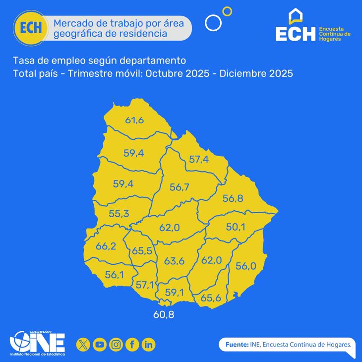 El mercado de trabajo cerró el último trimestre de 2025 con una tasa de desempleo de 7,2% a nivel nacional, pero con fuertes desequilibrios entre departamentos y niveles de informalidad que superan el 40% en algunas zonas del interior, según el último informe del Instituto Nacional de Estadística (INE) basado en la Encuesta Continua de Hogares (ECH).