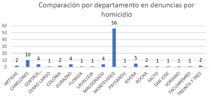 Respecto a los departamentos, Montevideo sigue siendo el de mayores denuncias por homicidio, con un total de 54 durante los primeros tres meses del año. Canelones, en tanto, se encuentra en segundo lugar con 10 denuncias, seguido por Rivera con 5, mientras que en Durazno y Maldonado cuentan con 4 denuncias por homicidios cada unos.