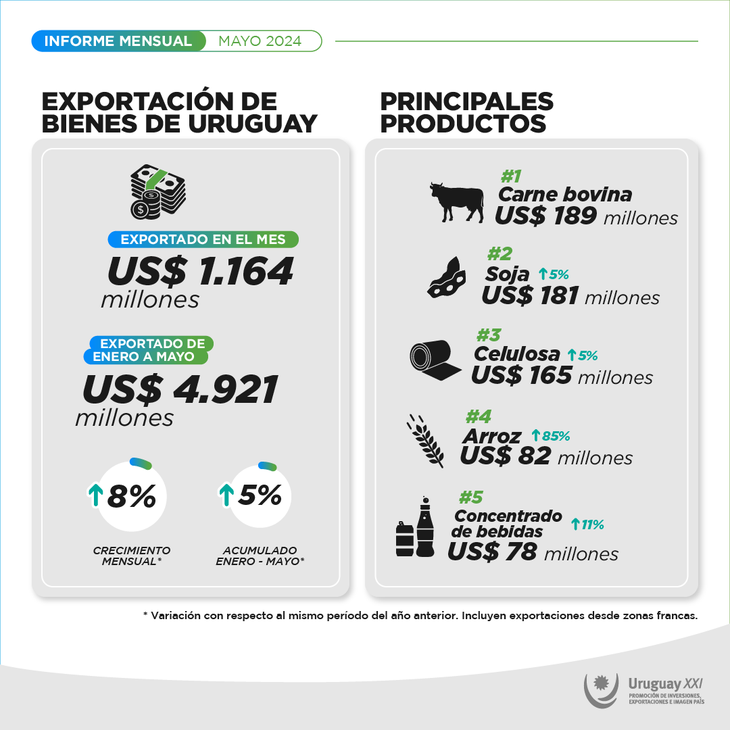 Las exportaciones uruguayas aumentaron un 8% interanual en mayo, luego de que las solicitudes de exportación, incluyendo las zonas francas, alcanzaran unos 1.664 millones de dólares, según datos que se desprenden del último informe de la agencia gubernamental Uruguay XXI.
