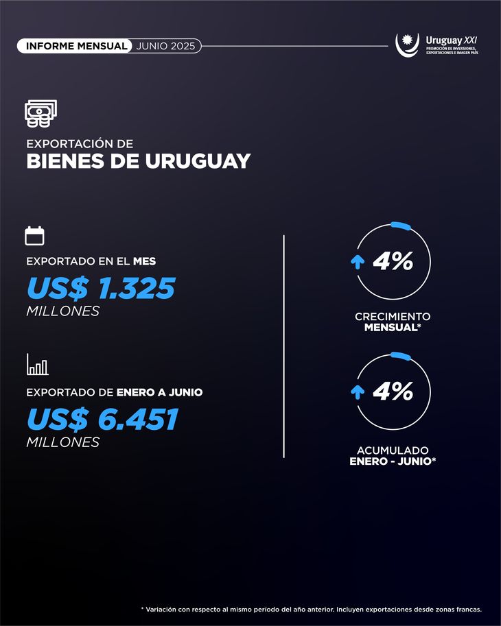 Las exportaciones de bienes crecieron un 4% intermensual en junio de 2025, alcanzando un total de 1.325 millones de dólares, de acuerdo al informe mensual de Uruguay XXI. Por otro lado, la soja, la celulosa y el arroz registraron caídas interanuales. El crecimiento estuvo impulsado por mayores ventas de carne bovina, vehículos y ganado en pie.