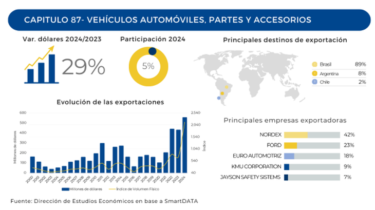 Completando el podio se destacó el desempeño de Vehículos automóviles, partes y accesorios, con una participación del 5% en el total y un crecimiento del 29% en las exportaciones, vinculado a los autos para el transporte de mercancías.