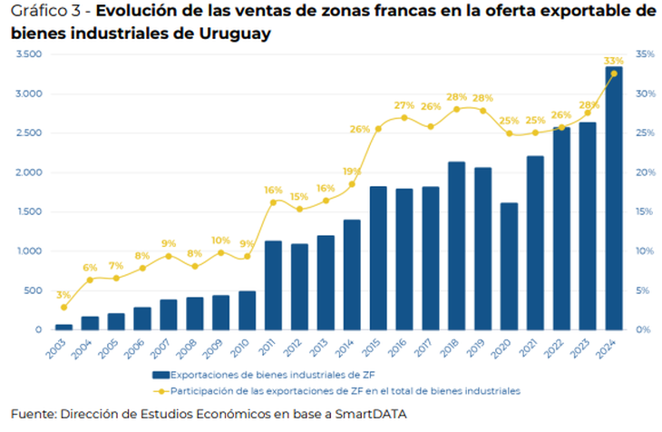 Las ventas externas del sector desde las zonas francas representaron casi un tercio del total (33%), un aporte récord que la CIU le atribuyó a la mayor actividad de la empresa UPM y de PepsiCo.
