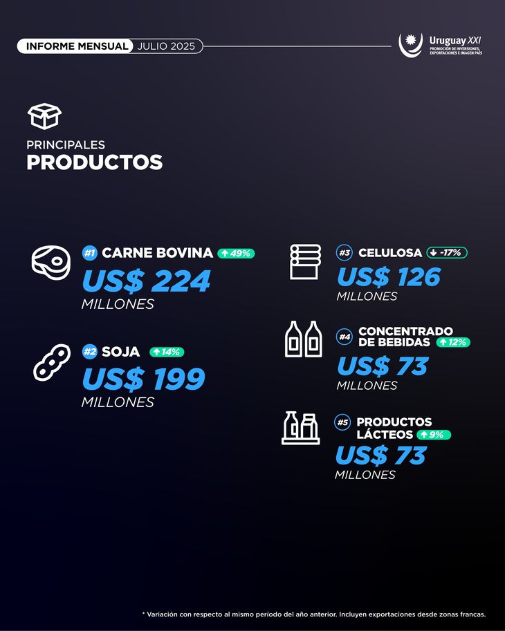 Las exportaciones de bienes crecieron un 7,4% interanual en julio, al totalizar 1.175 millones de dólares, con un fuerte impulso de los productos del agro, de acuerdo al último relevamiento de comercio exterior de Uruguay XXI.