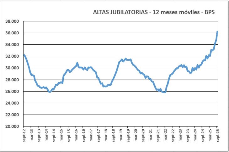 Con este fuerte crecimiento, el total de jubilaciones pagadas por el BPS pasó de casi 493.000 en septiembre de 2024 a más de 506.000 un año después: un incremento de 13.000 prestaciones, equivalente a un 2,3%.