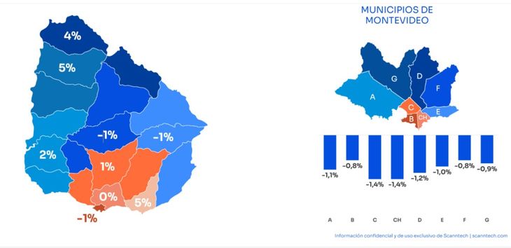 El estudio muestra que las ventas crecieron en el interior, especialmente en las localidades costeras del este y en la zona litoral. En contrapartida, Montevideo registró una caída del 1% en las ventas, con descensos más marcados en los municipios CH (-1,4%) y C (-1,4%), donde se concentra buena parte del consumo de servicios y productos de mayor valor agregado.