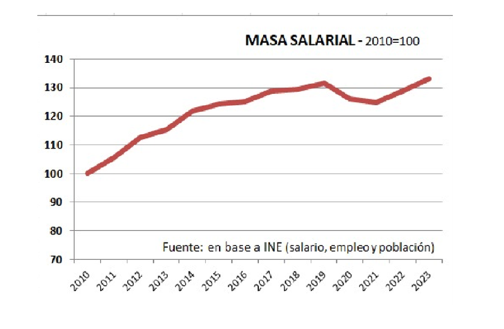 Al combinar la trayectoria salarial con la del empleo, incorporando también la evolución de la población, se llega al cálculo de la denominada masa salarial (el ingreso salarial total). En la gráfica adjunta se muestra su evolución estimada, tomando como base el año 2010. Para el cálculo se tomó el promedio del cuatrimestre enero-abril del Índice Medio de Salarios Nominales (IMSN) en términos reales, para cada año, la tasa de empleo promedio de los mismos períodos, y la estimación de población del INE. De la combinación de estos factores surge que la masa salarial está en niveles máximos históricos.
