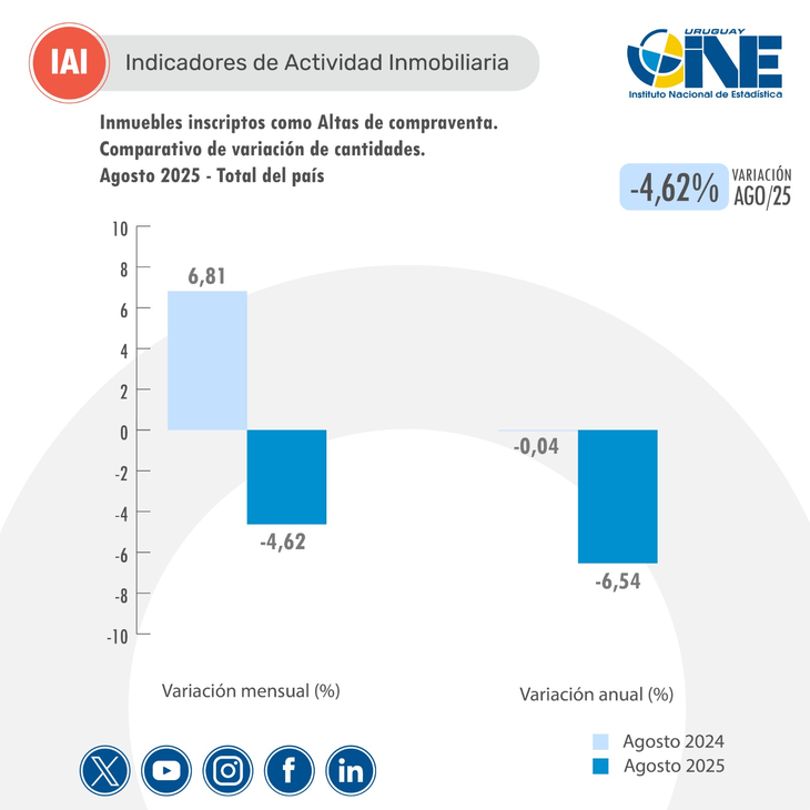 De acuerdo al último Boletín Técnico de Indicadores de Actividad Inmobiliaria (IAI) divulgado por el Instituto Nacional de Estadística (INE) la mediana de los precios de compraventa de inmuebles en dólares bajó un 11,1% en julio, una caída que se da tras el repunte en junio.