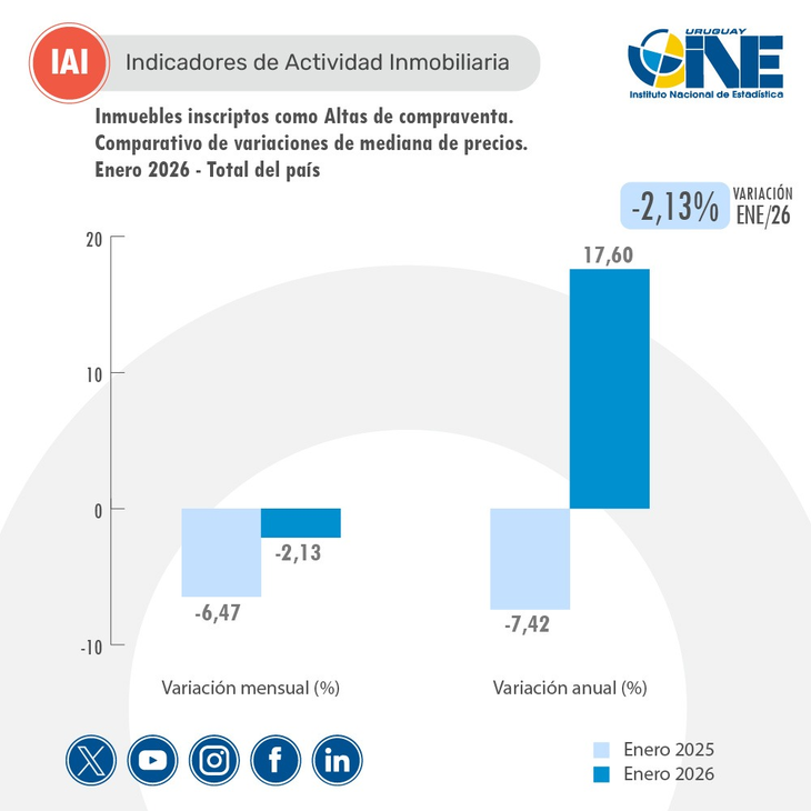 Los precios de las propiedades aumentaron un 12,38% durante 2025, con una mediana de valor que osciló en los 94.000 dólares en todo el país. De acuerdo a los valores de las transacciones que surgen del relevamiento del INE, el incremento punta a punta fue ampliamente superior al de la inflación en igual período, que fue del 3,65%, en medio del proceso bajista que continuó en el inicio de 2026.