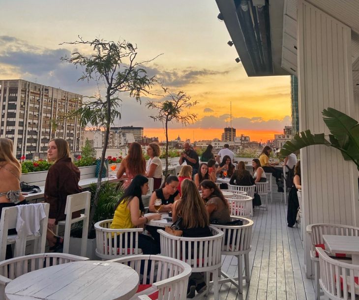 El piso 13 del Hotel Pulitzer es sede de Visit Sky Bar, un espacio de estilo mediterráneo para disfrutar de increíbles vistas de la city porteña. Su carta se destaca por una original selección de tapas de tono fusión, como los tacos de costillita pibil, la mini hamburguesa SkyBar o el Hot Dog Sky, con mostaza antigua y salsa anticuchera, entre otras. Para acompañar, los cocktails de autor como el sky set que mezcla vodka, Aperol, sandía y espumante, son el complemento perfecto para contemplar los mejores atardeceres de Buenos Aires desde la altura mientras se disfruta de la música y del ambiente.