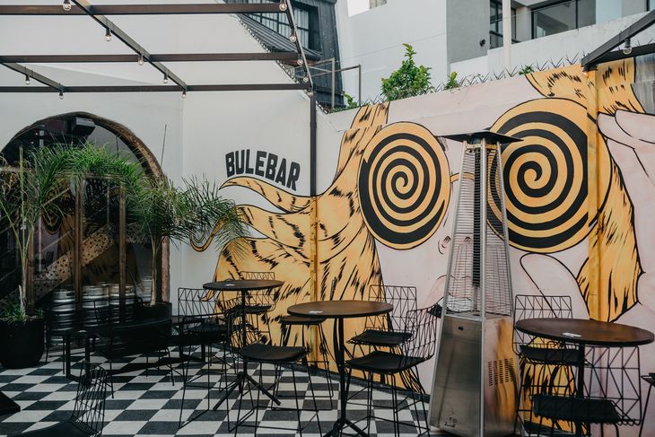 En el corazón de Saavedra, Bulebar se distingue no sólo por su coctelería clásica y de autor, sino también por su encantador patio trasero, perfecto para compartir una noche entre amigos o en pareja. El espacio combina un piso de baldosas en blanco y negro, mesas negras y murales psicodélicos en la gama del amarillo que, junto a las plantas y las luces cálidas, crean un ambiente íntimo. Las paredes de ladrillo a la vista y simil piedra aportan un toque rústico y acogedor, mientras que los parlantes exteriores ambientan con DJ Sets en vivo los viernes y sábados a partir de las 22 hs. Abierto todos los días desde las 17 hs, la propuesta gastronómica abarca street food internacional, que incluye desde quesadillas hasta ribs, y en coctelería sorprende con creaciones como el Amnesia, un cóctel de gin macerado en limón y cardamomo, con una dosis final de absenta.