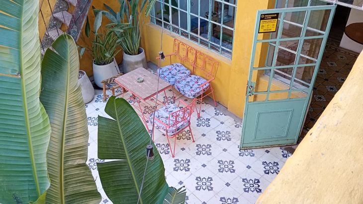Café Casa Tr3s cuenta con un encantador patio interno que invita a disfrutar al aire libre en un ambiente con historia. Con su fachada y muros interiores en tonos amarillos y un piso de adoquines y baldosas originales de 1890, el patio recuerda los días en que la casona funcionaba como almacén de ramos generales en Maschwitz. Los marcos de las ventanas y puertas, pintados de celeste, resaltan junto a un juego de jardín de hierro antiguo en color salmón, con almohadones estampados con aves. Grandes macetas llenas de plantas y un imponente banano añaden frescura al espacio, creando un rincón ideal para disfrutar de un café de especialidad, o para trabajar en un entorno tranquilo y natural.