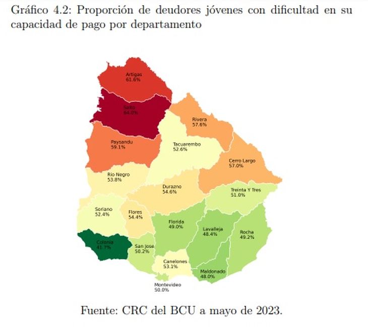 Al evaluar la distribución geográfica de los jóvenes deudores con dificultad en su capacidad de pago, Colonia es el mejor posicionado, con un 41,7%, mientras que en el otro extremo se encuentra Salto, con un 64%.