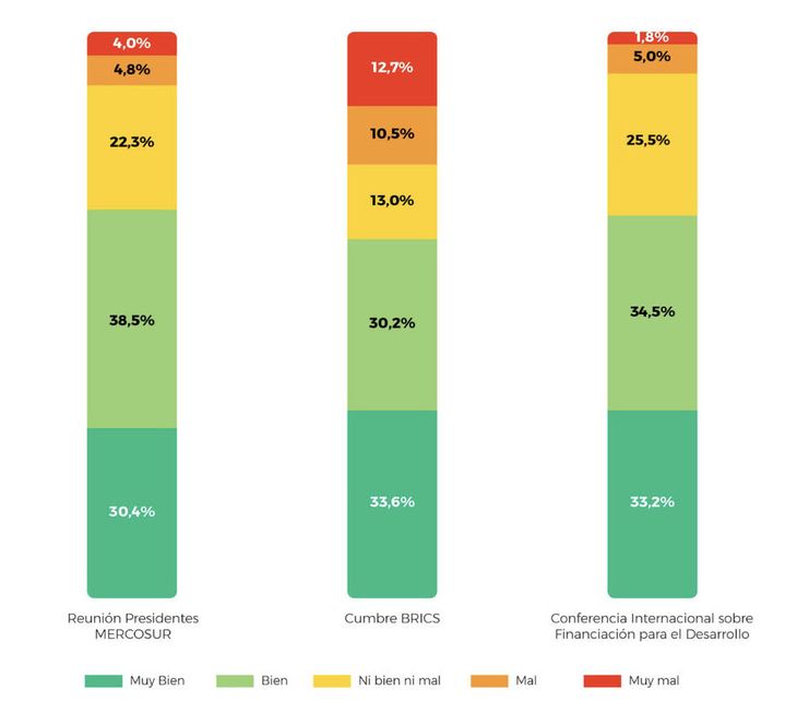 La consultora Nómade realizó el sondeo entre el 12 y el 19 de julio con 863 casos, analizó el nivel de conocimiento y evaluación pública. De acuerdo a los resultados, la participación mejor evaluada fue en la reunión del Mercosur, con un 68,9% de opiniones positivas, seguida por el evento en España (67,7%) y, por último, la presencia en los BRICS, con un 63,8%. La investigación destacó que "la participación internacional del presidente es ampliamente reconocida por la población y muy bien evaluada por el conjunto sin distinción de perfiles ni votantes".