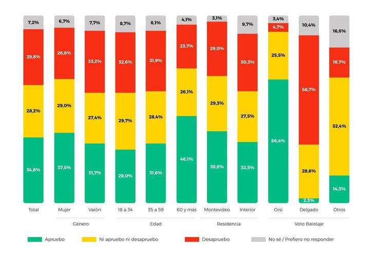 El análisis etario muestra que el respaldo aumenta con la edad: entre los jóvenes de 18 a 34 años la aprobación es de 30,6%, y entre mayores de 60, alcanza el 40,5%. A nivel geográfico, Montevideo muestra un respaldo levemente mayor (37,8%) que el interior del país (33,2%).