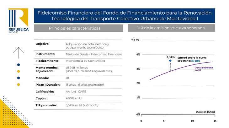Vale destacar que el fideicomitente de la emisión es la Intendencia de Montevideo (IMM) en su calidad de administradora del fondo. Los títulos tienen asociado un cupón de 4,5% lineal anual en UI, con pagos de cuotas mensuales de capital e interés.