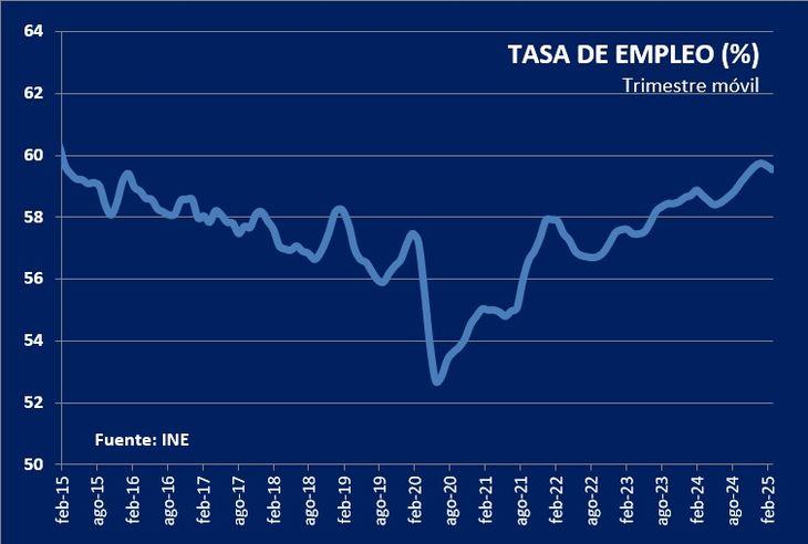 El Instituto Nacional de Estadística (INE) divulgó en las últimas horas datos relevantes vinculados al mercado de trabajo. En febrero la tasa de empleo quedó en 59,4%, medio punto por encima de su valor de hace un año; esto implica que hay 24.000 ocupados más que en igual mes de 2024. La tasa de desempleo quedó en el 7,9%, un descenso de cuatro décimas en el último año.