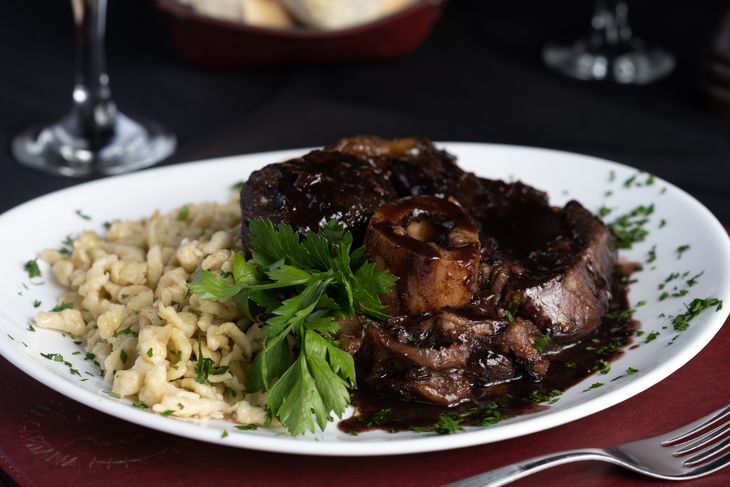 En La Capitana —bodegón porteño de marcado valor histórico que le rinde tributo a Eva Perón—, la cocina funciona como un gesto de memoria y una celebración de la tradición porteña. Entre los platos destacados aparece la milanesa La Capitana, una clásica milanesa de ternera con papas fritas a caballo, conocida como una de las comidas favoritas de Evita. También se ofrece el osobuco braseado en horno de barro, servido con una reducción agridulce de vino Malbec y puré de papas, una preparación de largo aliento que expresa el espíritu bodegonero del lugar. La experiencia puede acompañarse con los vermuts de la casa, servidos en jarras pensadas para compartir.