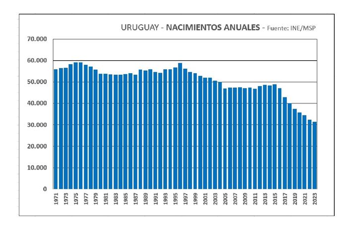 En este trasfondo, nuevos datos demográficos prenden nuevas alarmas: los nacimientos en 2023 marcaron un nuevo mínimo histórico en más de un siglo, al caer a 31.385 (gráfica). Las tendencias demográficas del Uruguay ya eran claras en cuanto a complicar la sustentación del pilar de solidaridad intergeneracional, porque la esperanza de vida es cada vez mayor y los nacimientos son cada vez menos. Estas variables demográficas son claves al momento de hacer proyecciones económicas del sistema (lo que se conoce como auditoría). De hecho, el presidente Luis Lacalle Pou había vislumbrado que se podía establecer una reforma pensando en el mediano y largo plazo, sin afectar las condiciones de los trabajadores actuales, es decir, reformando para los futuros trabajadores que aún no estaban en el mercado. Pero los parámetros conocidos hasta ese momento fueron revisados y el resultado fue peor al que se preveía; era imposible no afectar a los que ya estaban desarrollando su vida laboral. Así, la última reforma, aprobada en el Parlamento (ley 20.130) aumentó la edad jubilatoria, aunque de manera muy gradual para hacer el cambio lo menos brusco posible.