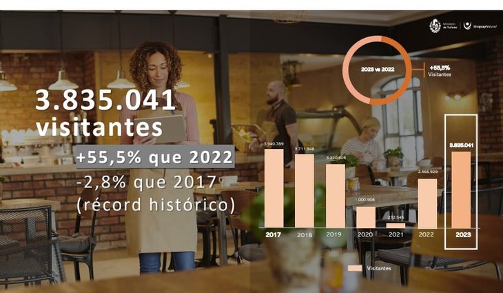 En cuanto al turismo receptivo, Uruguay registró un incremento del 55,5% en el número de visitantes en comparación con el mismo período en 2022, quedando por debajo de la cifra histórica del 2017 por un 2,8%.