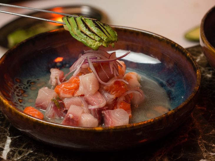 Entre sus platos destacan la arepa con bondiola braseada, barbacoa de tamarindo, hinojo, chicharrón, coleslaw y cilantro; el ceviche de pesca blanca con leche de tigre de ají amarillo, maíz chuspillo, mango verde, cilantro, cebolla morada, jalapeños y chips; los tacos de entraña marinada, chuleta ahumada, frijoles, salsa macha, chicharrón, cebolla morada, cilantro y lima; o el aguachile de uva y ciruela, trigo sarraceno, cebolla encurtida, huacatay, eneldo, tajín casero y casabe.