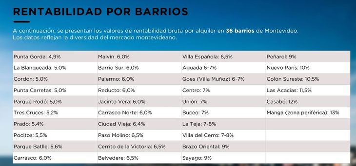 Según los datos de la tabla de rentabilidad por barrios, estos son los 10 barrios con mayor rentabilidad bruta anual en Montevideo: