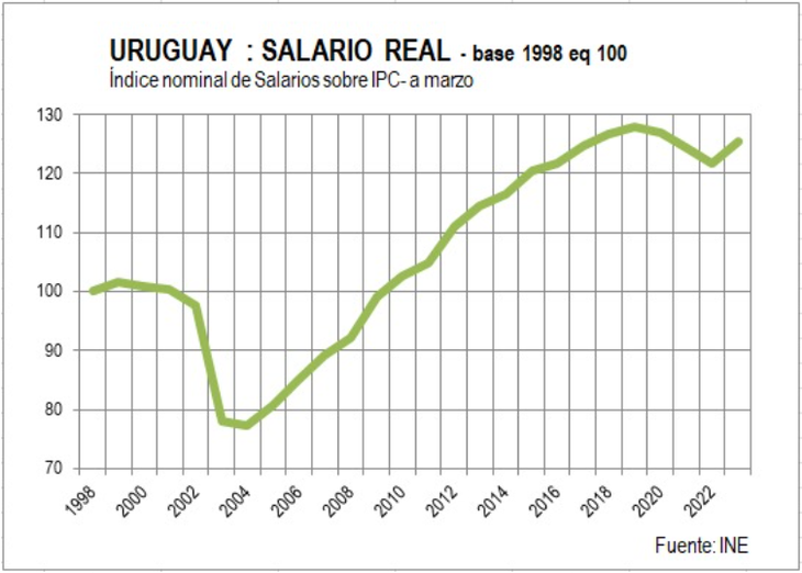 El Instituto Nacional de Estadística (INE) informó hoy que el salario medio en Uruguay subió 10,5% en el último año. Considerando que la inflación en el período fue 7,3%, el salario real subió 3% anual.