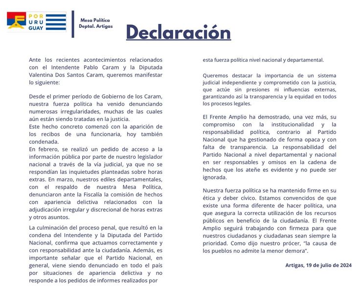 El senador del Frente Amplio, Eduardo Brenta, aseguró a Radio Montecarlo que la gestión de Caram “manejaba el departamento como una gran estancia” y señaló que “se le robó a los ciudadanos 8 millones de dólares para pagar horas extras falsas”, al considerar que el caso llevó a “una crisis institucional” en el distrito.
