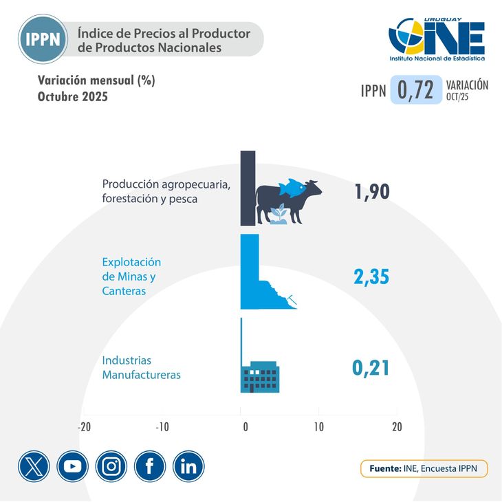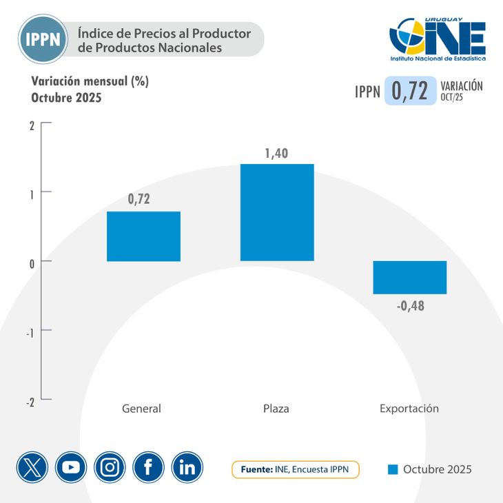 El Índice de Precios al Productor de Productos Nacionales (IPPN) se incrementó un 0,72% en comparación con setiembre, con un incremento mayor del IPPN plaza, es decir los bienes comercializados dentro de Uruguay, que llegó al 1,40%, lo que puede suponer una señal alcista para la inflación.