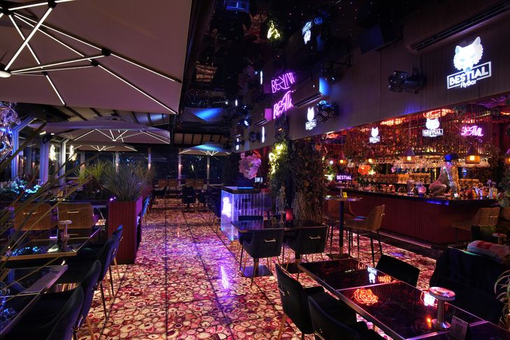 La ambientación es uno de los grandes atractivos de Bestial Fly Bar. Jardines verticales, pisos de ónix retroiluminados, esculturas de gran tamaño y una barra central de diseño escultórico construyen un clima que remite a una película futurista. Los ventanales permiten que la ciudad forme parte del decorado, mientras que los livings y mesas altas invitan tanto a una noche larga como a una visita más breve antes de seguir el recorrido por Palermo.