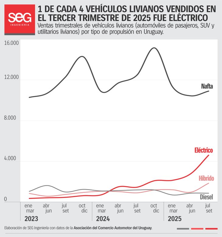 Los datos surgen de un informe de SEG Ingeniería basado en datos de la Asociación del Comercio Automotor del Uruguay (ACAU). El mercado automotor uruguayo ha mostrado un cambio estructural en las preferencias de consumo, impulsado por la reducción de costos operativos, incentivos fiscales y el avance de la infraestructura pública de carga. Los datos de ACAU revelan que la curva de ventas de autos eléctricos comenzó a despegar a partir de 2023 y mantiene desde entonces un ritmo de crecimiento exponencial.