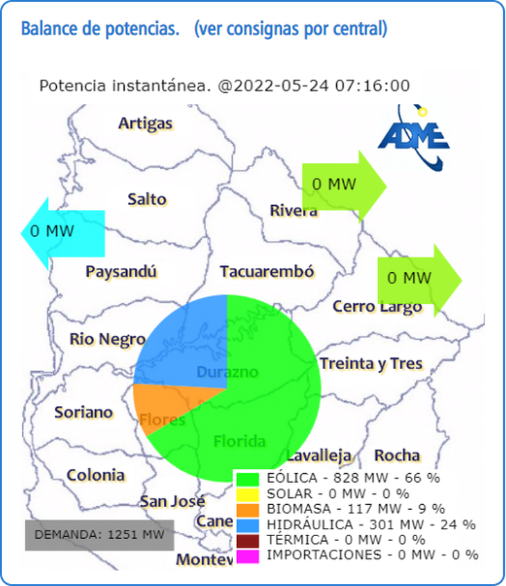 En la publicación diaria de la Administración del Mercado Eléctrico (ADME) se observó un hito en términos de energías renovables en el país: el 100% de la generación eléctrica del día se produjo con fuentes renovables, un fenómeno que se ha repetido en varias oportunidades.