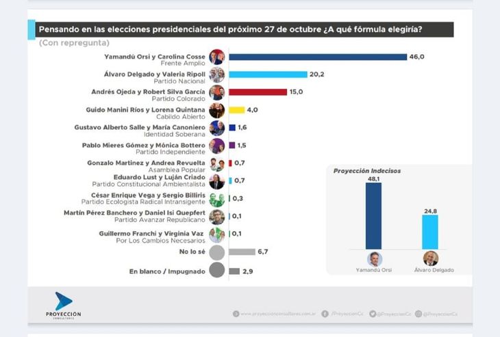 Incluso, Proyección Consultores realiza una proyección de los indecisos (incluye voto en blanco y anulado), que llega al 9,6% y es el porcentaje que todos los partidos políticos aspiran a captar. Sumando esas previsiones al escenario electoral, la fuerza de izquierda alcanzaría una intención de voto del 48,1%, contra el 24,8% que sumaría el PN.