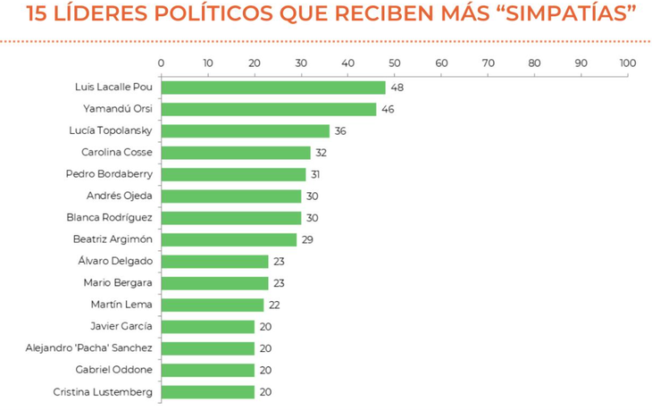 En cuanto a los políticos que más "simpatías" despiertan, la lista está encabezada ampliamente por Lacalle Pou y Orsi, que ostentan el 48% y el 46% de aprecio de los uruguayos; siendo así los únicos que, incluso sin llegar el 50% —"cifra históricamente muy difícil para los líderes políticos"—, se mantienen cerca de esa cifra y bastante por encima de los demás nombres que aparecen.