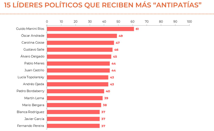 En el lado opuesto están quienes recogieron la mayor cantidad de "antipatías" por parte de la población. En este caso, quien lideró la lista por bastante diferencia fue el exsenador y líder de Cabildo Abierto (CA), Guido Manini Ríos, con el 61% de las respuestas negativas.