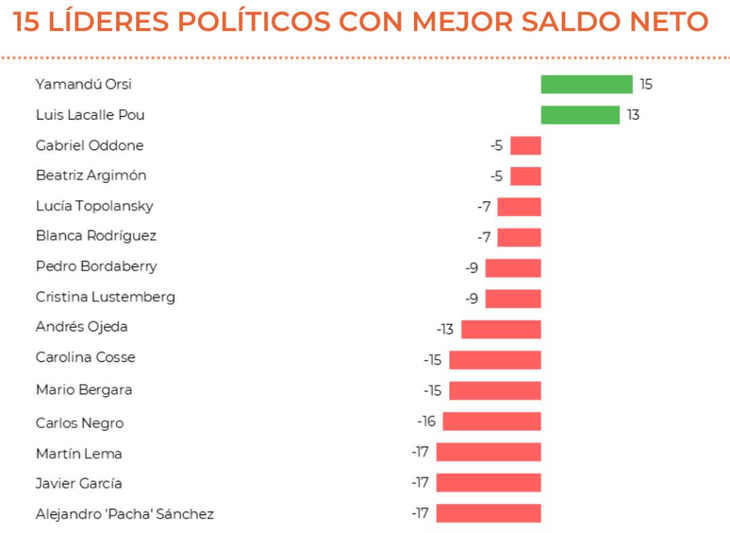 En este escenario, Orsi y Lacalle Pou son los únicos dirigentes que tienen un "saldo neto" positivo. Por debajo de ellos, hay un grupo de líderes con saldo negativo, pero inferior a 10 puntos, integrado por Oddone, Lustemberg, Topolansky, Argimón, Blanca Rodríguez y Pedro Bordaberry.